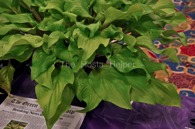 This cultivar was registered by Bob Solberg of Green Hill Farm in North Carolina in 2011. It is a hybrid of H. 'Strawberry Banana Smoothie'. The leaves have wavy edges and red petioles. It is a medium size plant that sets lavender flowers.