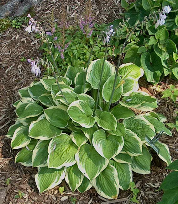 A seedling of H. 'William Lachman', this cultivar was registered by Alex Malloy of New York in 2000. The large size (20 inches high) mound has foliage that is slightly wavy and corrugated with good substance. Pale purple flowers appear in July.