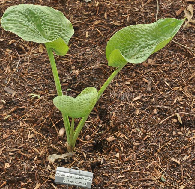 This medium size cultivar is a non-registered hosta from Rick Sawyer of Maine. The leaves are broadly ovate, cupped and corrugated with thin substance. It bears white flowers in July.