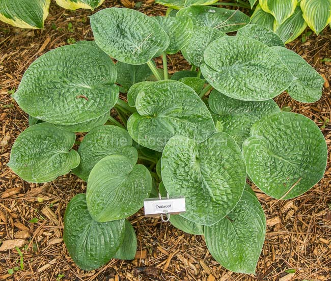 by 45 inches wide) hybrid of H. 'Inniswood' × open-pollinated "Seedling OP97" in 2012. The foliage is medium blue-green, heavily corrugated, nearly round and glaucous on top. Near white,