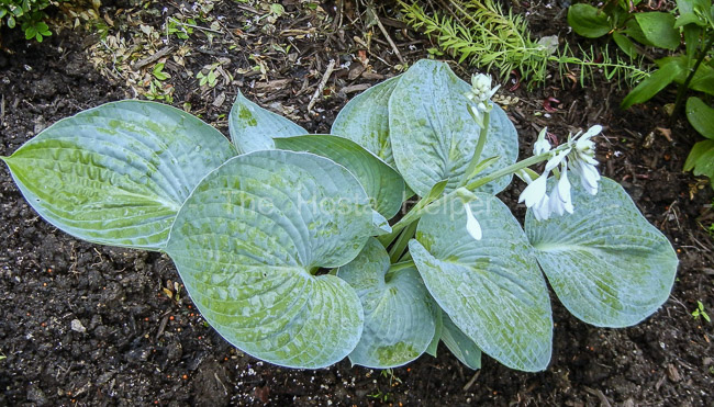 Dr. Dick and Jane Ward of Ohio registered this hybrid of H. 'Ice Palace' × an unnamed hosta in 2011. It is a small size plant at 7 inches high by 23 inches wide. The leaves are medium blue-green with a nearly round shape. They are dull on top and flat. Near white, tubular flowers bloom in June.