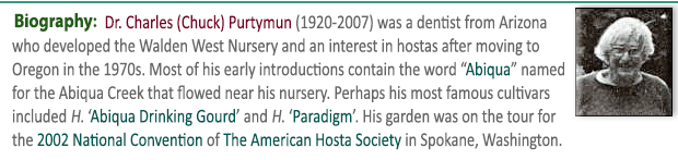 This cultivar was registered by Dr. Charles Purtymun at Walden West Nursery in Oregon in 1999 as a sport of H. 'Abiqua Recluse'. A large size (22 inches high by 48 inches wide) plant, it has heavily corrugated, wavy foliage. The near white flowers are borne from late June into July.