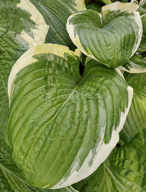 This non-registered cultivar is a sport of H. 'Blue Umbrellas'. It has green foliage with yellow marginal variegation.