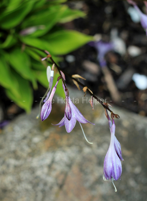 The registration materials state: "Mini hosta perfect for rock garden or trough.  Rippled green leaves cluster into a tight vase-shaped mound on red petioles.  Spring weather can bring a red blush to tips and edges.  Cheery purple & white flowers have a snowflake pattern inside...limited fertility, choosy about pollen."