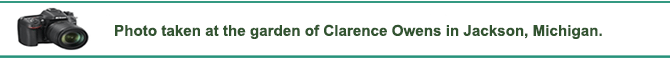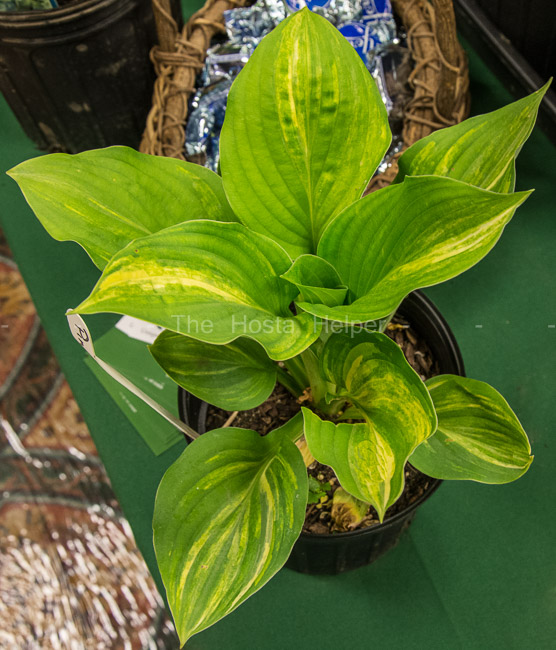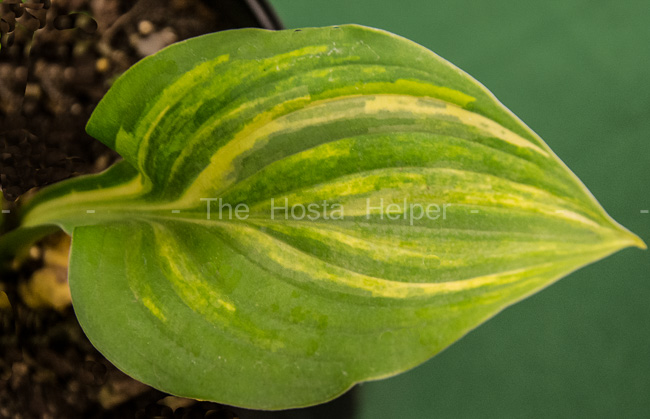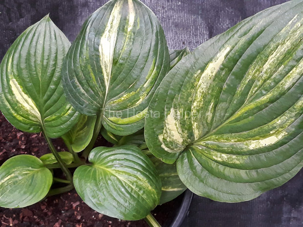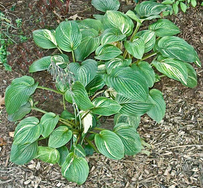 It is a medium size plant about 18 inches high by 30 inches wide with green foliage that has yellow and white streaked variegation. This highly prized breeding plant has leaves that are broadly ovate shaped, slightly corrugated, slightly wavy and slightly shiny on top. Very pale lavender, tubular flowers bloom from late June into July followed by viable seeds.
