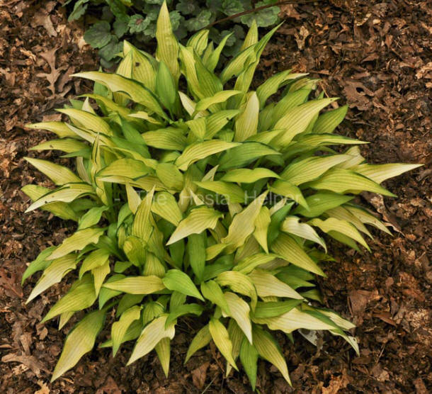 The Hosta Handbook by Mark Zilis (2000), its "...leaves all-green in spring changing to an