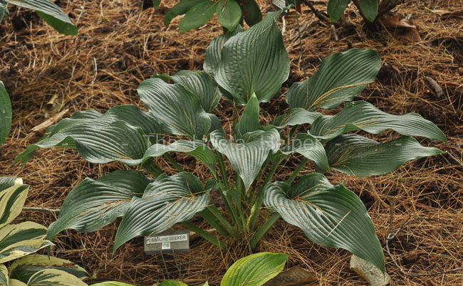 This cultivar is a hybrid of the species H. kikutii x H. 'Halcyon'. Its leaves are broadly lanceolate, slightly wavy with a twist. The mound has a semi-upright form.