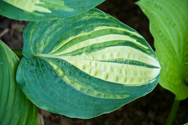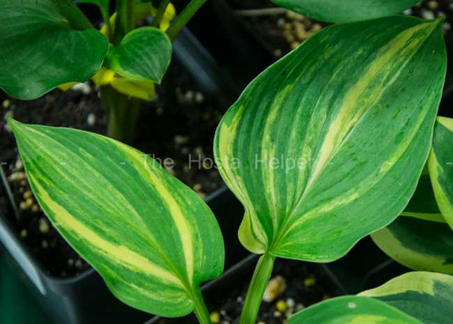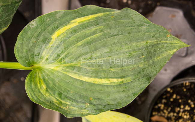 This slow growing cultivar is a tissue culture sport of H. 'Powder Blue' was registered by Mark Zilis of Illinois in 2010. The large size plant grows to around 22 inches in height with a spread of about 45 inches. It has blue-green foliage with creamy white and green streaked variegation. The leaves are moderately wavy, moderately corrugated, broadly ovate and has glaucous bloom on top. Near white tubular flowers bloom from June into July.