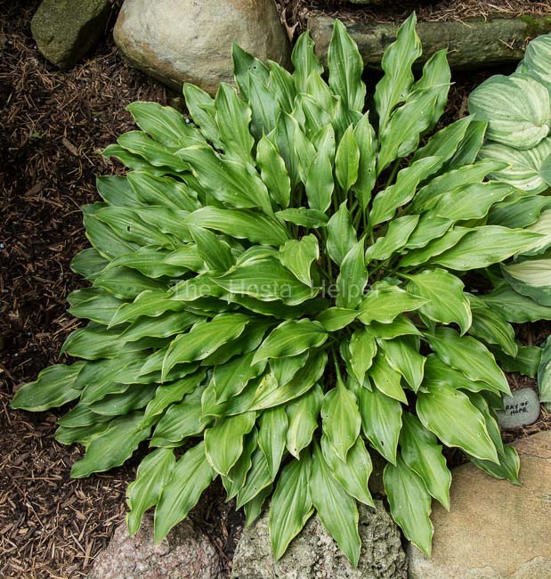 The dense mound has medium green colored, rippled, intensely wavy, heavily streaked leaves. Its