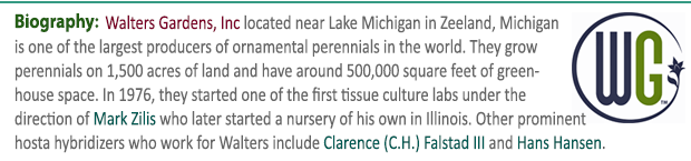 Walters Gardens, Inc. of Michigan registered this tissue culture sport of H. 'Krossa Regal' in 1987. It is a large size (30 inches high by 72 inches wide) mound of vase-shaped foliage with a cream margin. The leaves are ovate, slightly wavy, smooth textured and have thick substance. It has flower scapes up to 5 feet tall that bear medium lavender flowers from late July into August. It does not form seed pods.