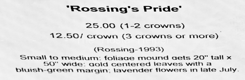 Listed as a sport of H. 'Fortunei Hyacinthina', this cultivar was registered by Richard Rossing of Minnesota in 1993. It forms a medium to large size mound that bears lavender flowers from mid-July into August.