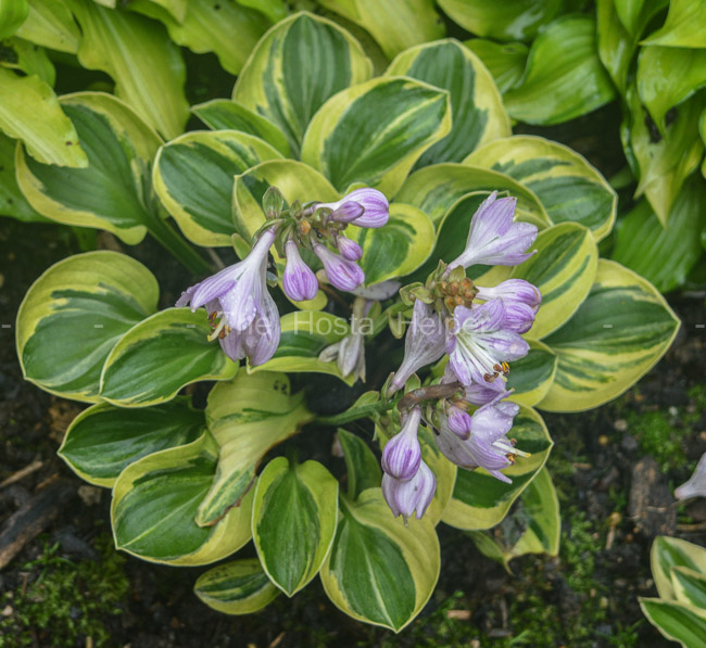 "H. 'Royal Mouse Ears' is described as having blue-green foliage with numerous gold and creamy-white streaks throughout the leaf blade. Jan van den Top reports it emerges with plain bluish-green leaves and streaking appears a month or so later. In addition to streaks in the center, also expect distinct creamy margins. Further, don't be surprised if 'Royal Mouse Ears' settles out as a margined-leaved 'Frosted Mouse Ears'. Recall: 'Frosted Mouse Ears' and 'Holy Mouse Ears' originally came from 'Royal Mouse Ears'."