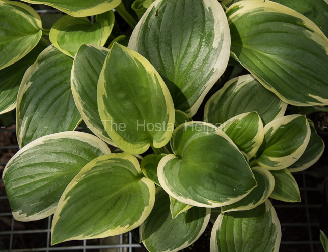 foliage has a creamy white marginal variegation. Its leaves are slightly corrugated, broadly ovate and slightly shiny on top.