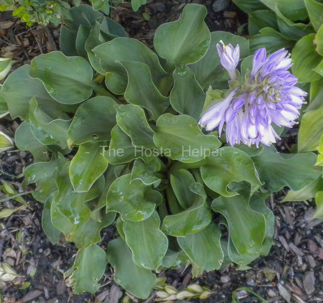 Mark Zilis of Illinois registered this sport of H. 'Blue Mouse Ears' in 2011. The miniature size plant grows to around 6 inches in height with a spread of around 14 inches. The leaves are medium blue-green and are heavily rippled, slightly cupped, moderately wavy and nearly round with a cordate base. Medium lavender, tubular flowers bloom in July. The plant turns dark green by late July.