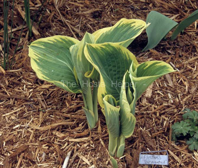 W. George Schmid in his Hosta Species Update on The Hosta Library (2006) says, "...was originally called by the invalid name H. fluctuans ‘Variegated’ (the term “Variegated” is invalid). This cultivar is easily the most famous and desired hosta both in Japan and western gardens. This sport was found near the city of Sagae...in Yamagata Prefecture in an area where the species populations occur."