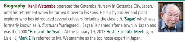 According to The Hostapedia by Mark Zilis (2009), "This cultivar, long admired in Japan, can now be considered a hosta "classic" in American gardens. Its large, vase-shaped mound habit makes it the ideal background or specimen plant...It is difficult to propagate by tissue culture , with low multiplication rates and high numbers of "off-type" plants the norm."