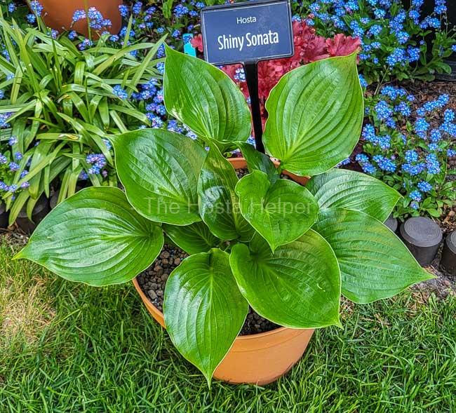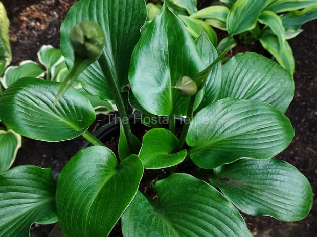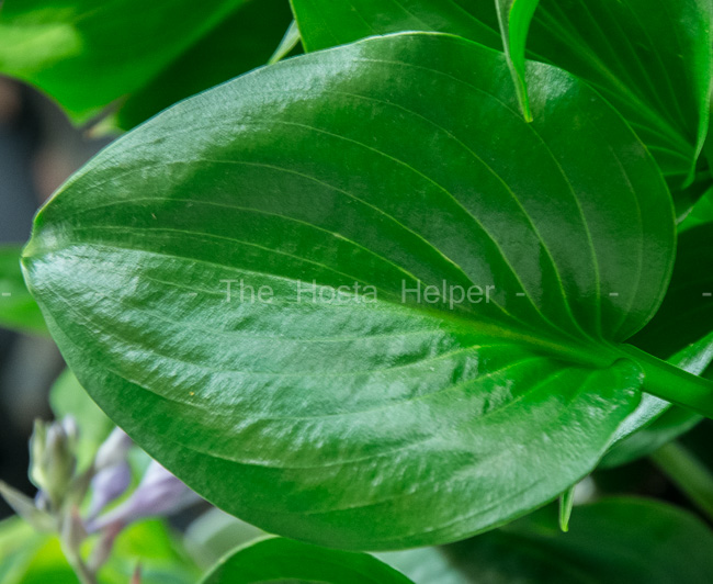 of H. 'Moonlight Sonata'. It is a medium size hosta with very shiny, dark green foliage. The leaves