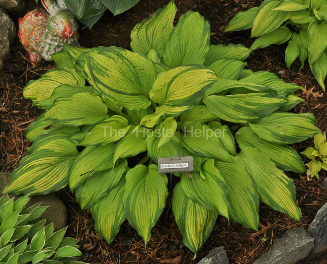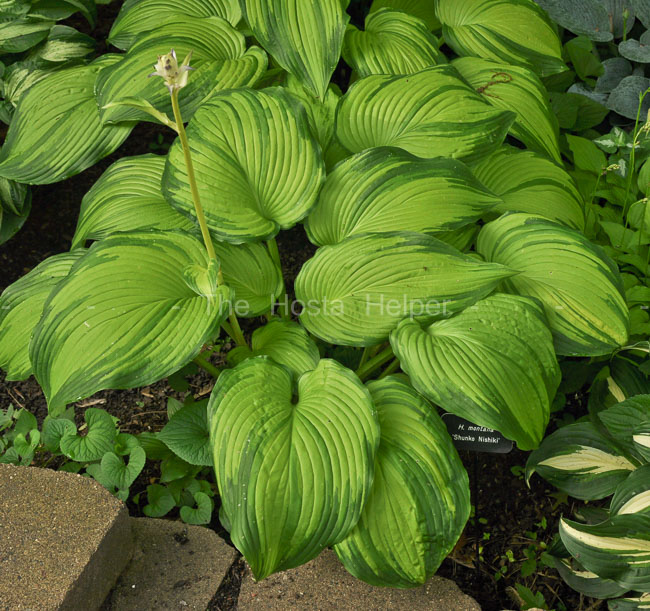 The Hosta Handbook by Mark Zilis (2000), "...foliage is similar to 'Choko Nishiki', but not as streaky as 'Shuho
