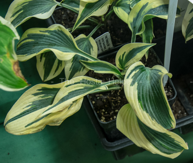 This cultivar is a sport of H. 'Sleeping Beauty' from Jan van den Top of the . It is a medium size plant with blue-green, heart shape leaves that have a wide yellow marginal variegation that turns cream colored as the season progresses. Pale lavender flowers appear from late July into mid-August.