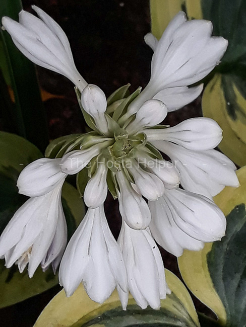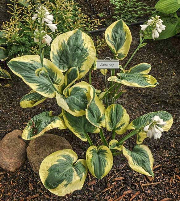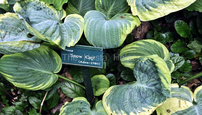 Paul Aden of New York registered this cultivar in 1980. It is a cross between H. 'Wide Brim' × H. 'Royal Rainbow'. 'Snow Cap' forms a large size (19 inches high) mound of broadly ovate, moderately cupped foliage with