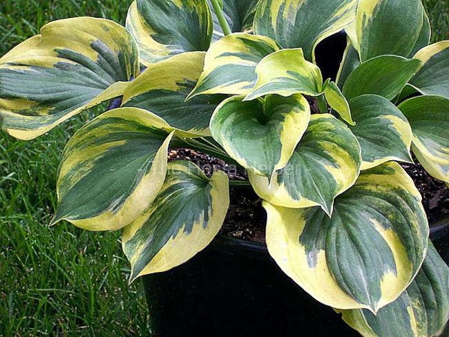 broadly ovate, dark green foliage that has creamy yellow