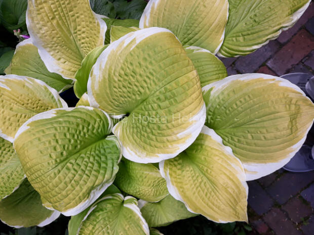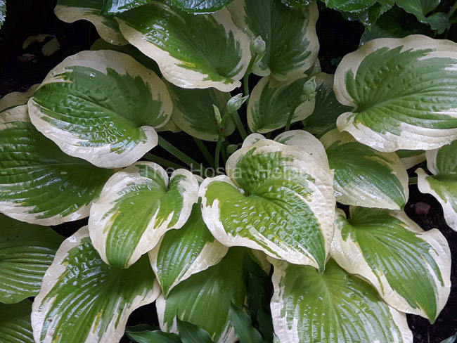 This cultivar was listed on the MyHostas Database website. This non-registered cultivar is of unidentified parentage. It is a medium size hosta about 12 inches high by 16 inches wide with pale green foliage that has an irregular creamy white marginal variegation. Lavender flowers in clusters bloom in July.