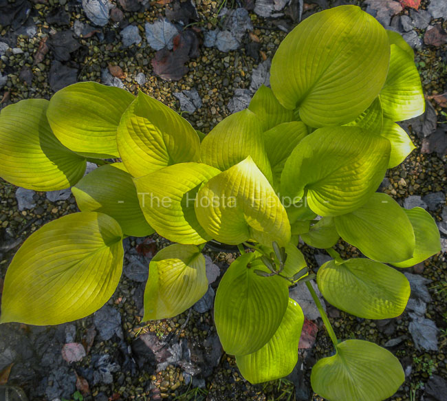 Dr. Dick and Jane Ward of Ohio in 2014, this hybrid of H. 'Fat Cat' × an unidentified hosta grows into a medium size plant about 18 inches