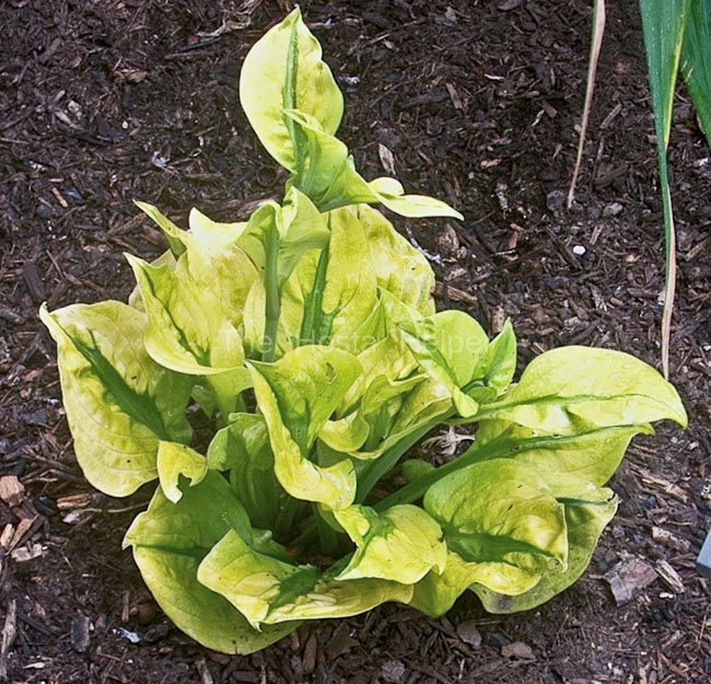 The New Encyclopedia of Hostas by Diana Grenfell (2009) states in its Hosta Hybrids for Connoisseurs chapter: "The new leaves emerge solid green, the center gradually turning yellow. This hosta will always be a talking pint so should be placed where its interesting leaf can be seen close up...The green leaf center appears to be "stitched" onto the yellow margin, the irregular vein pattern causing distortion and puckering this area of the leaf."