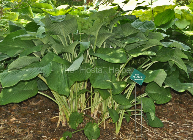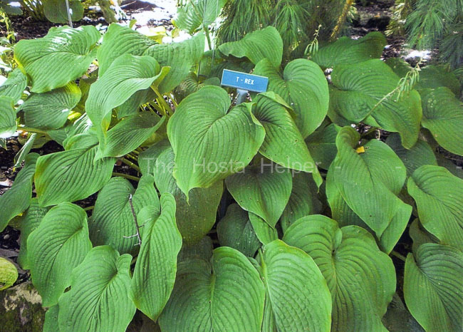From The Hosta Journal, (2006 Vol. 37 No. 2), this cultivar was originally registered in 1999 as H. 'Tom Rex' because, at the time, the rules for naming would not allow the intended name of 'T Rex'. In 2003, a committee of the International Code of Nomenclature for Cultivated Plants reviewed the situation and ruled that the name 'T Rex' was, in fact, acceptable. The name 'Tom Rex' is considered a synonym now and this hosta has been sold under both names by various sources over the years." BTW - This plant is not built like a car and does not have a hubcap diamond star halo.
