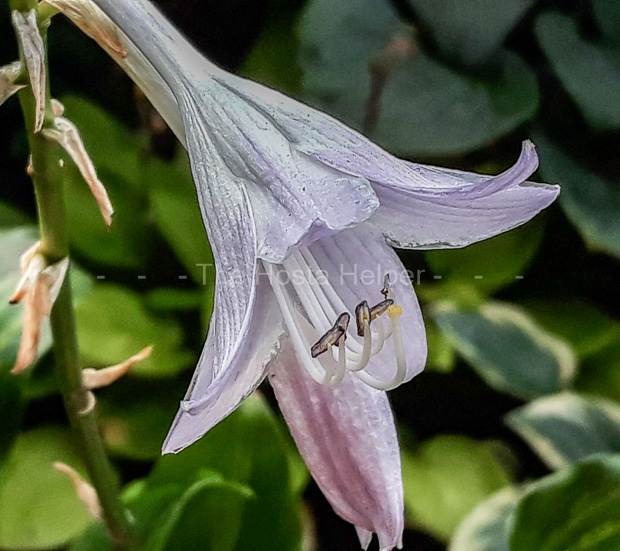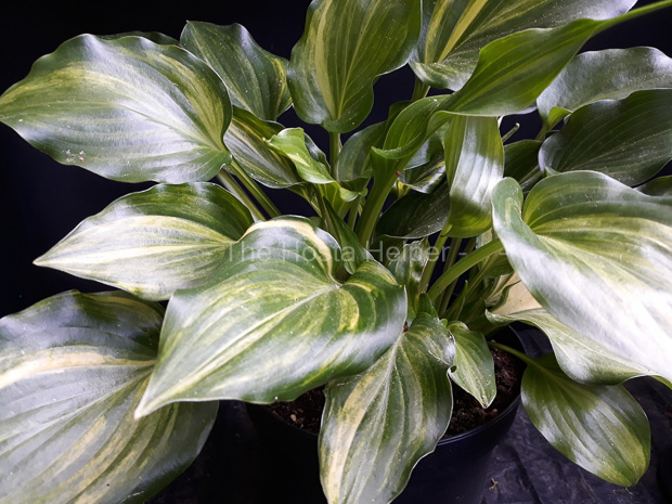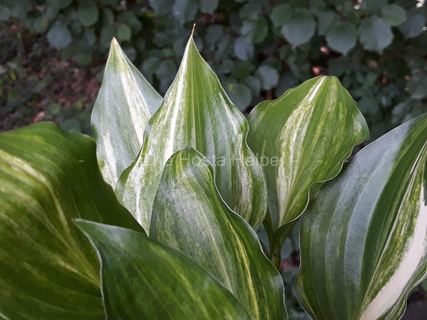 This is a non-registered cultivar which is a seedling of H. 'Invincible' was originated by Curt Hanson of Crintonic Gardens in Ohio and named by Marco Fransen of Fransen Hostas in the Netherlands. The medium size hosta has shiny green leaves that have creamy white streaked variegation. It bears fragrant, lavender colored flowers.
