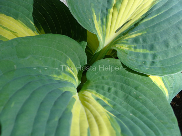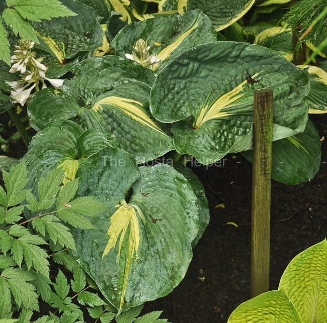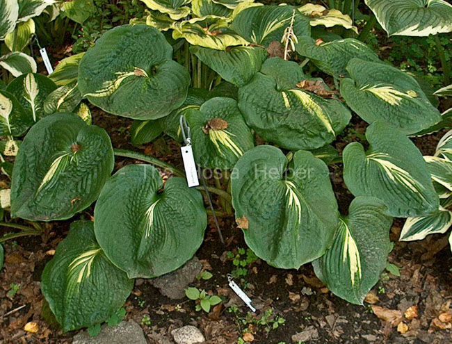 Originated by Allen Rick Crowder of Hawksridge Farms in North Carolina and registered by AHS/G. H. Alley in 2020, this upright cultivar is a sport of H. 'Elegans'. The foliage is dark bluish green (131A RHS Colour Chart) with strong yellow green (144C RHS Colour Chart) medial (center) variegation. Its broadly ovate to nearly round leaves are slightly wavy, moderately corrugated with prominent veins. The top and bottoms of the blades have a glaucous bloom.