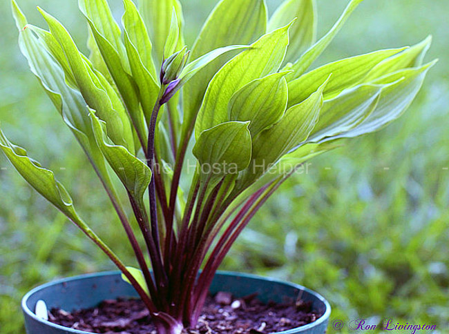 A very upright growing, medium size hosta with narrow, wavy, light green leaves. It has dark red petioles and flower scapes, this non-registered cultivar was originated by Ron Livingston of Michigan.