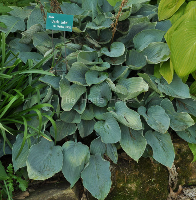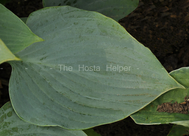 Frank Nyikos of Walnut Grove Nursery in Indiana as a cross of H. 'Blue Splendor' × H. 'Halcyon'. The broadly ovate shaped, slightly corrugated foliage