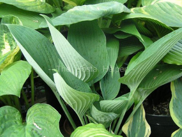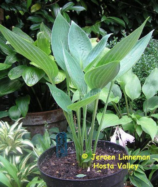 This non-registered cultivar of unidentified parentage was introduced by Jeroen Linneman of the Netherlands in 2007. This medium size hosta has narrowly ovate, blue-green leaves. It has extremely long, very upright petioles.