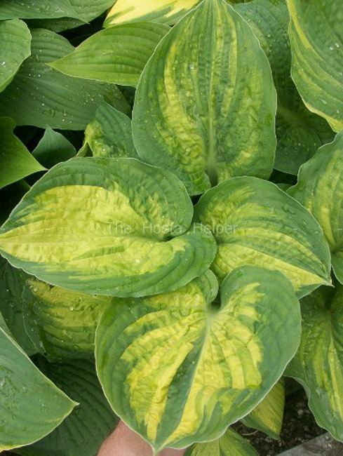 This non-registered cultivar was introduced by Jeroen Linneman of the Netherlands in 2012. It is a medium size seedling of H. 'Sally and Bob' × H. 'Skylight'. The foliage is light blue-green with yellow medial (center) and streaked variegation.