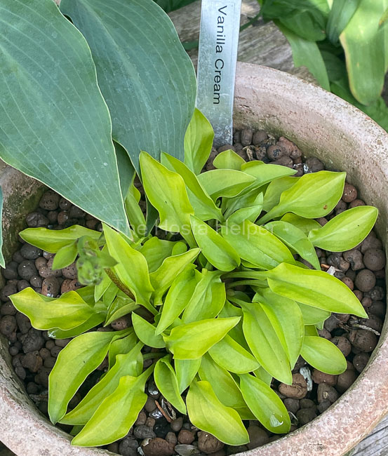 of all-green leaves - are the yellow-leaved 'Vanilla Cream'...sporting to 'Wylde Green Cream'...which has a dark green margin and yellow center, and to 'Ice