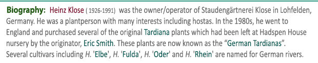 This cultivar is a seedling of H. rectifolia which was originated by Heinz Klose of Staudengärtnerei Klose in Germany and registered on his behalf by Peter Ruh of Ohio in 2006. It is a medium size plant about 17 inches high by 28 inches wide with dark green foliage. The leaves are slightly rippled, ovate, slightly folded, slightly corrugated and very shiny on top. Medium lavender, tubular flowers with white stripes bloom in August.