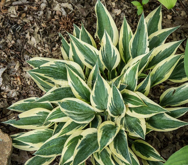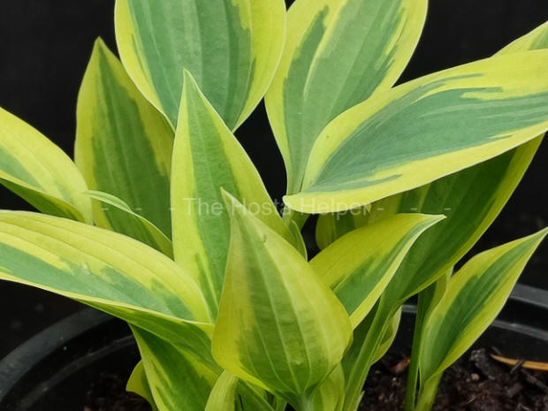 A hybrid of a sport of H. 'Crepe Suzette' × H. 'Riptide', this cultivar was registered by Judy Springer of Virginia in 2014. It forms a small size (9 inches high by 18 inches wide) mound of medium green leaves that are streaked or have a creamy yellow margin. The leaves are moderately flat and have a glaucous bloom on top.