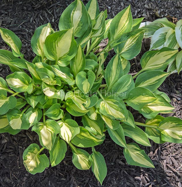 (center) variegation. The foliage is broadly ovate, slightly wavy, slightly corrugated, slightly folded and