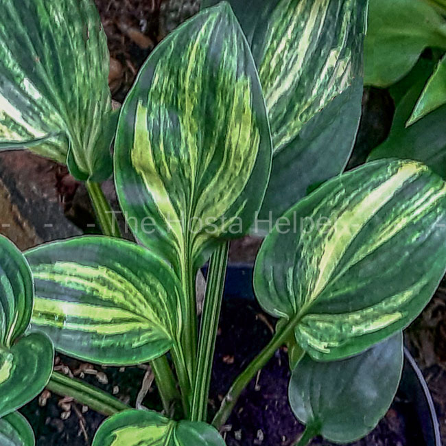 This fast growing, medium size (13 inches high by 22 inches wide) cultivar which was registered by Danny Van Eechaute of Belgium in 2009 is an open-pollinated seedling of H. 'Sea Prize'. The medium green, white streaked leaves are broadly ovate, slightly corrugated and dull on top. Pale lavender, tubular flowers bloom from July into August. It sets viable seeds.