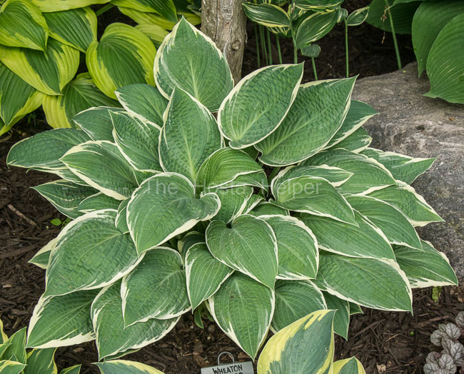 Rick Goodenough of Massachusetts is the originator of this non-registered sport of H. 'Wheaton Blue'. The foliage is blue-green with white marginal variegation. It forms a large size (23 inches high) mound of moderately corrugated foliage with good substance. The pale lavender flowers are borne from mid-July into August.