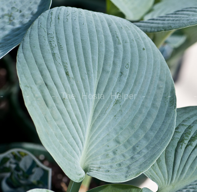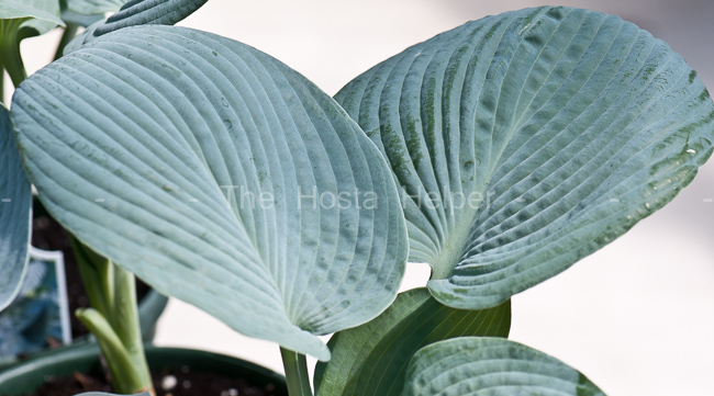 This large size hosta is a hybrid of [(((H. 'Color Fantasy' × (H. 'Big Daddy’ × H. 'Big Daddy)) × H. ‘Abiqua Drinking Gourd’) × (H. 'Love Pat' ×  H. 'Popo'))] which was registered in 2011 by Don Dean of Minnesota. The leaves are intensely cupped, moderately twisted, rippled and heavily corrugated with thick substance. It grows to a large size plant about 23 inches in height with a spread of around 32 inches. The flowers are near white in color and bloom from July into August.