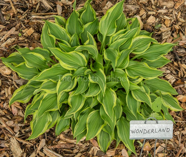 small size (7 inches high by 14 inches wide) hosta with green foliage that has chartreuse