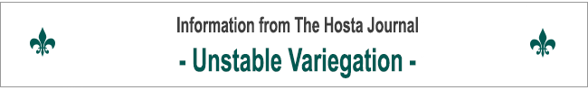 1) An article by Warren I. Pollock in The Hosta Journal (1998 Vol. 29 No. 1) discusses the fact that many variegated hosta cultivars are considered "unstable." This means that all or individual divisions of the clump may revert to either a solid color or other form of variegation. You may end up suddenly having a single colored hosta or you will need to separate a solid colored division from the clump. Three nurseries were cited who include notations about "Unstable" hostas. The following is a composite list of those cultivars mentioned: